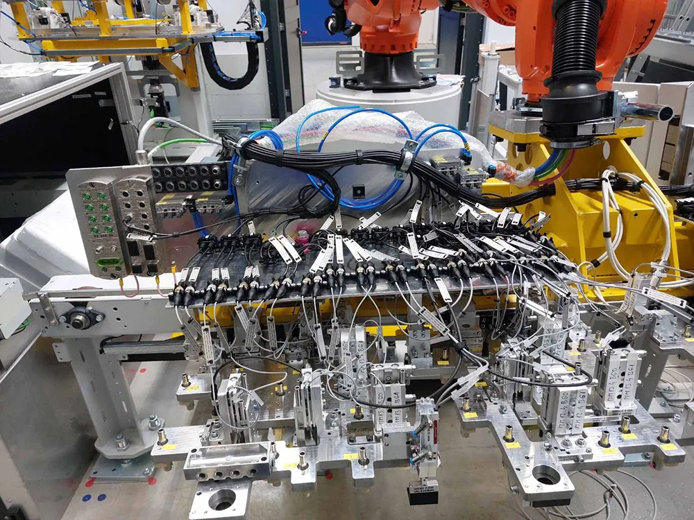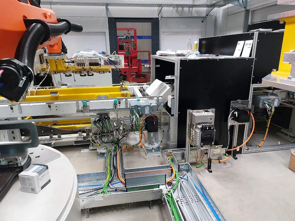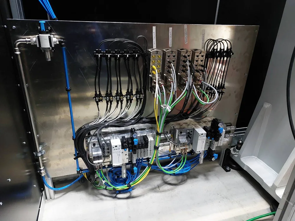 Den Greifer haben wir sauber und exakt verdrahtet, alle Sensoren und Leitungen eingebunden. Parallel haben wir uns um die Peripherie gekümmert: Kabeltrassen, Steuerleitungen, Anschlusspunkte – alles so verlegt, wie wir es auch selbst haben wollen würden: klar strukturiert, ordentlich beschriftet, gut zugänglich.